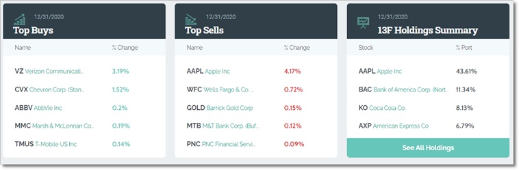 매도를 한 종목은 AAPL, WFC, GOLD, MTB, PNC순으로 투자 비중액을 줄였는데요 전체적으로 이 비중은 Whleswisdom 닷컴에서 확인이 가능합니다.