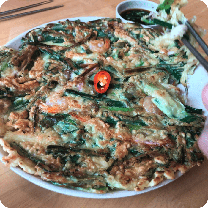 주문을 하고 나서 5분 정도 지나고 나서 우리가 주문한 첫 번째 메뉴인 해물파전이 나왔어요. 담백하고 심플한데 들어간 것은 오징어와 파, 새우등이 파숑숑 처럼 들어가 고소하게 익혀져 나왔어요~~ 가격은 12,000원.