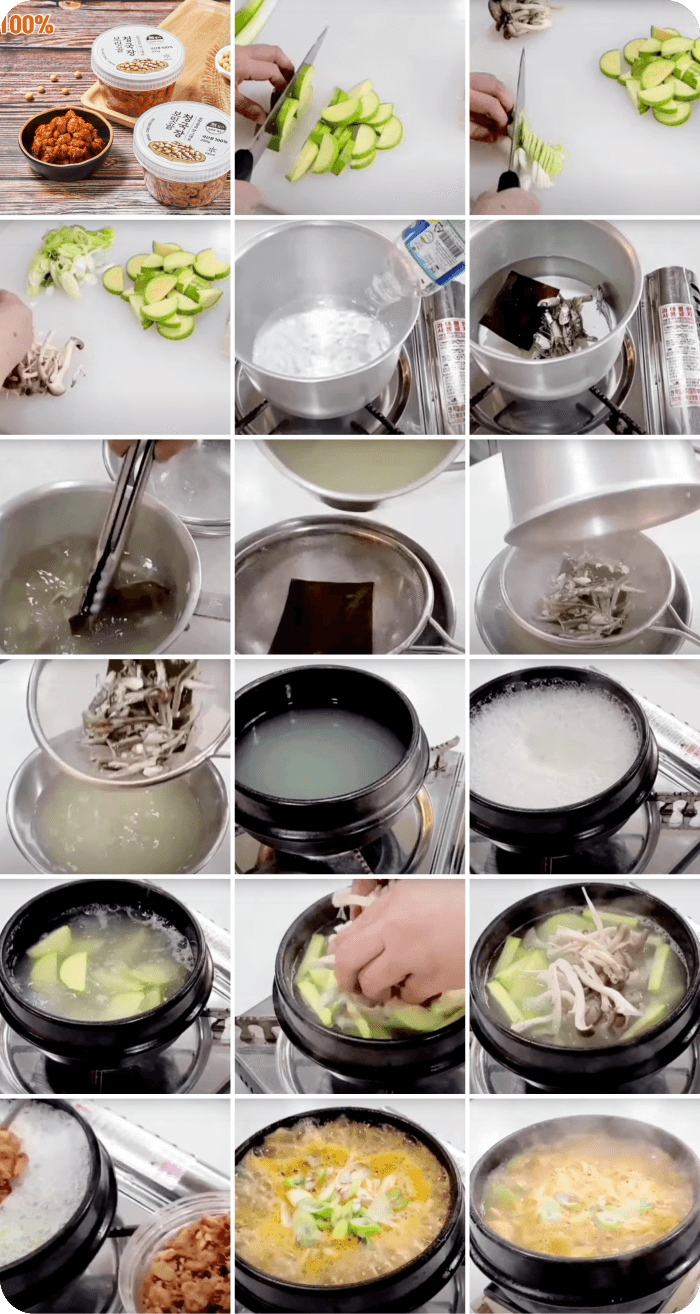 4) 두부를 도톰하게 썰어 줍니다. 애호박도 두부처럼 도톰하게 썰어 준비를 한 뒤 끓이는 청국장에 200g 청국장을 다 넣어 줍니다. 3분 정도 끓여 줍니다. 충분히 끓어오르면 두부를 넣어줍니다. 고명으로 대파를 넣어 주면 청국장이 완성이 됩니다.