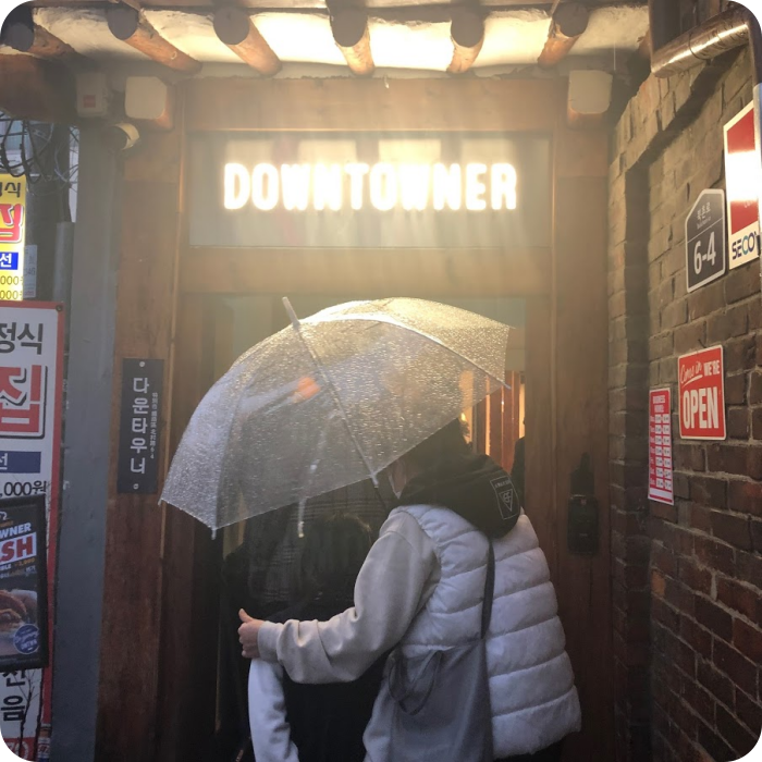 들어가기 전 줄이 두줄이 서 있었는데요 왼편 줄은 노티드 도넛 가게로 들어가는 줄이었고, 다른 한 줄은 바로 다운타우너 버거 집으로 들어가는 우산만 보이는 줄이 길게 서 있었는데요 우리는 이번에 노티드는 먹어 봤기 때문에 다운 타우너 줄로 향했답니다. 처음에는 이 두 개 브랜드가 같은 GFFG 이준범 대표 회사 브랜드 인 줄을 모르고 있었어요.