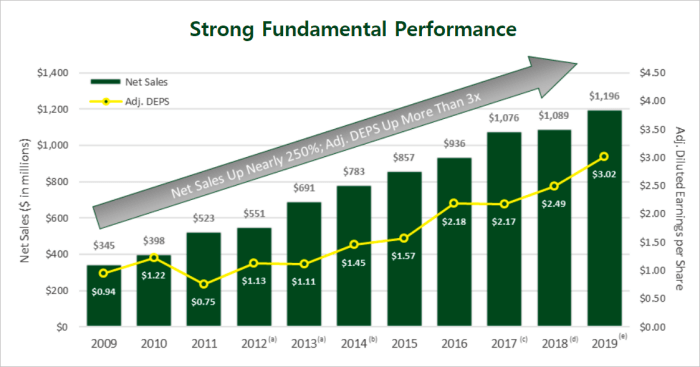 2009 년부터 2019 년까지 Calavo의 매출은 거의 250 % 성장을 했는데 이는 건강에 대한 관심의 증가 등이 매우 커지면서 매출 성장을 견인하고 있으며 이로 인해 주당 순이익은 같은 시간에 세 배로 증가한 기업에 속합니다. 또한 배당을 주는 농업 농작물 생산 및 가공 관련 미국 주식 관련 주입니다.