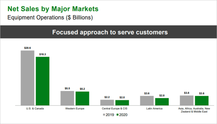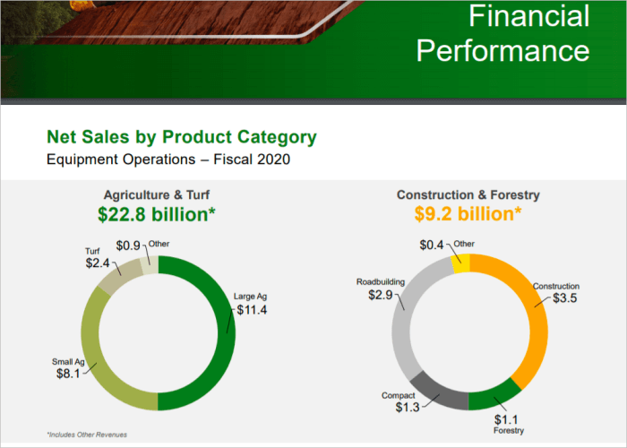 농업용 농기구를 제조하는 Deere는 농업 및 잔디와 건설 및 임업 두 가지 핵심 부문을 운영 중에 있습니다. 비중이 높은 농기구 매출은 농업 및 잔디 깎는 기계에서 나오고 있습니다.