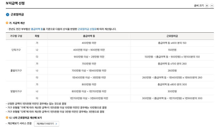 근로 장려금 지급액 산정 및 금액 확인 계산
