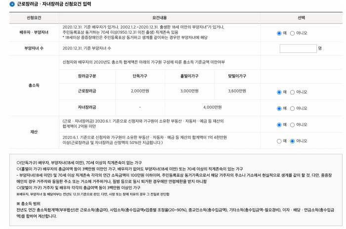 근로장려금의 소득기준이 있는데요 전체 가구원의 부동산이나 자동차 등 재산 합계액이 2억원 미만인 경우만 해당이 되며, 부채를 포함한 기준이므로 신청 시 확인을 꼭 해 보셔야 합니다.