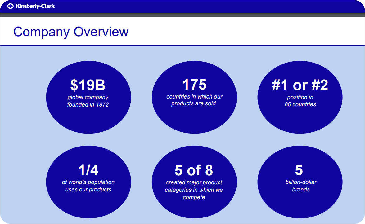 Kimberly-Clark의 시작은 1872년에 John A. Kimberly, Havilah Babcock, Charles B. Clark 및 Frank C. Shattuck이라는 4 명의 젊은 사업가 시작한 기업으로 알려져 있으며 킴벌리, 클라크 및 Co를 설립하기 위해 3 만 달러의 자본을 가지고 시작을 했습니다. Kimberly-Clark는 175 개국에서 운영되는 글로벌 소비재 회사로 종이 타월, 기저귀, 휴지 등 일회용 소비재를 판매하는 거대 회사 중의 하나이며 Personal Care 영역인 Huggies, Pull-Ups, Kotex, Depend, Poise 등 우리가 친숙한 브랜드와 Consumer Tissue 영역인 Kleenex, Scott, Cottonelle, Viva 등으로 구성이 되어 있습니다. 연간 약 200 억 달러를 창출합니다. 수익. Kimberly-Clark는 시가 총액이 480 억 달러 인 대형주 입니다.