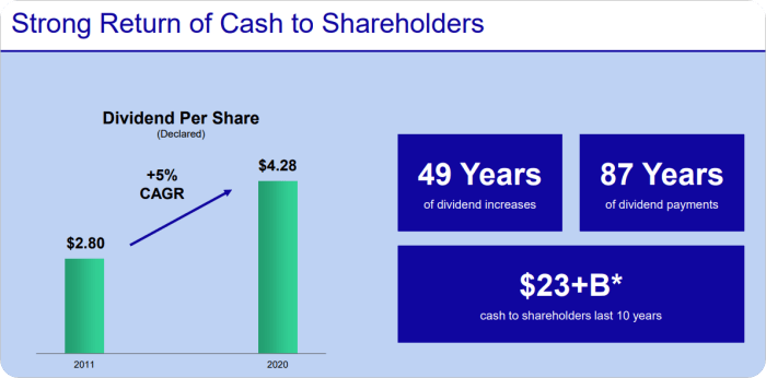 49년 배당금액을 늘려오면서도 2021 년에는 6억 5천만 달러에서 7억 5천만 달러의 환매를 진행이 예상이 됩니다.