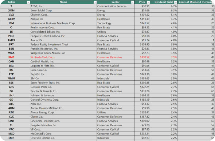 또한 킴벌리 클락의 경우는 21년 4월 매월 상위 배당주 리스트에 상위에 포함이 되어 있습니다. 49년 동안 배당주 성장을 해온 대형주 중의 하나이기도 합니다.