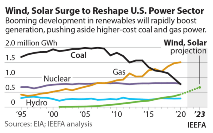 또한 아래 IEEFA에서 발표한 자료를 살펴보면, 풍력과 태양력의 생산량 규모 변화 예측을 통해 향후 재생 에너지 사업에 구조적이 변화를 암시하고 있음을 알 수가 있는데요 이와 관련된 관련주들의 동향도 변화가 있을 것이라 보입니다.
