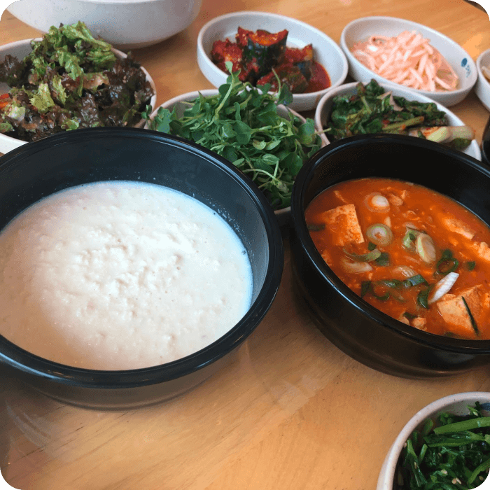 해물파전을 조금 먹고 나니 본 메뉴 반찬들이 나오기 시작했어요. 이 중에서 메인 반찬은 바로 청국장과 비지 형태 두부였는데요 저는 개인적으로 오이도 정말 맛있게 보여서 자세히 살펴봤어요.
