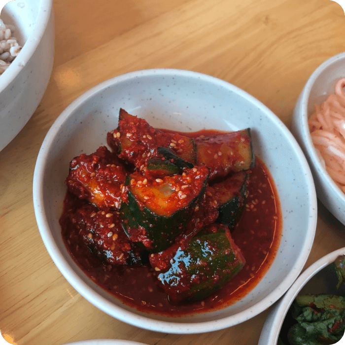 반찬 중에서 추천할 만한 시그니처 반찬은 오이 소박인데요 아래 오이에 들어간 양념 색깔 보이세요? 정말 색깔이 빨간데 오이가 원래 수분이 많은데 양념이 더 시원하게 느껴질 정도여서 강력 추천하는 오이소박인데요 꼭 드시기 바랍니다.