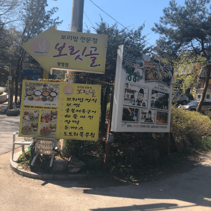 보릿골 광명 하안점 입구에는 광명시 보건소가 위치에 있고 주변이 온통 맛집이 보여 있었는데요 아리랑 구이집, 운산채 쌈밥집, 까치 카페 등도 모여 있고 바로 뒤가 구름산 등반을 할 수 있는 곳이었어요. 이곳에 이렇게 많은 가족들이 식사하고 잠깐 산책을 할 수 있는 곳이 있었다니 믿기지가 않았습니다.
