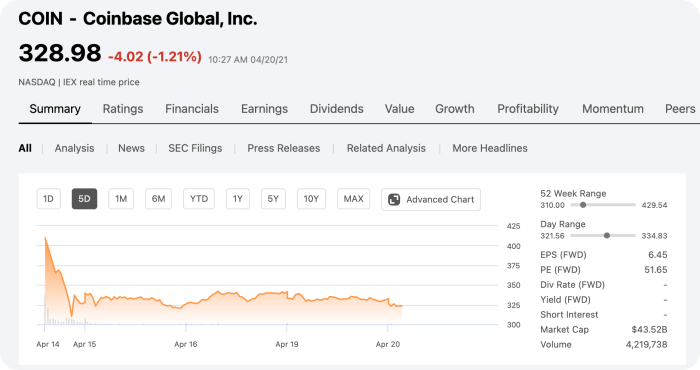 Coinbase는 1월부터 3 월 15 일 사이에 비공개 판매로 판매된 IPO 주식이 주당 평균 가격이 343.58 달러였다고 sec에 서류를 제출했었는데 시가총액이 이 경우 898억 달러로 예측이 되고 있었는데요 미국 이외의 투자자가 IPO에 앞서 COIN의 예상 가치로 거래할 수 있는 독일 기반의 암호 화폐 거래소 FTX의 Coinbase 선물 계약은 $ 463.845에 거래가 되어서 이 중간 어딘가 가격으로 될 것으로 보였는데 한때 나스닥에서는 400달러가 넘는 가격으로 거래 가격이 상승했지만 마감은 최근 주가인 330달러로 마감을 했습니다.