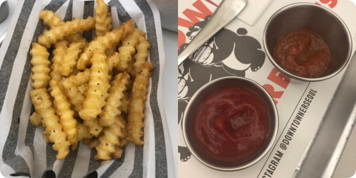프렌치프라이는 제가 시식할 때 두 가지 소스가 나왔는데요 하나는 맵고, 하나는 일반 케첩 소스였어요. 둘 다 프라이에 찍어 먹는 소스인지는 궁금하기는 했는데, 일반 케첩과 같이 먹는 것이 더 맛이 있었어요.